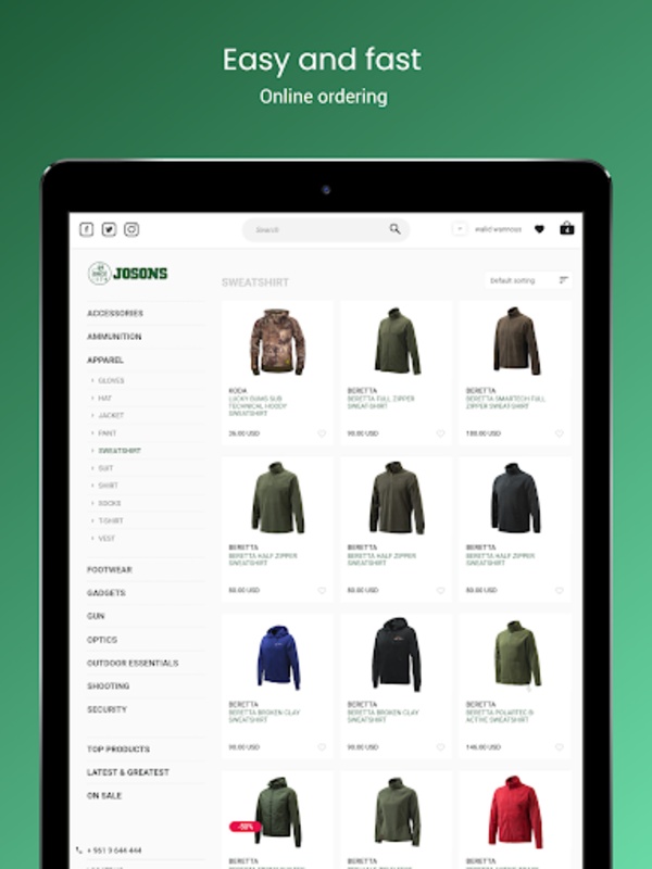 Aktualisieren Sie Ihre Outdoor-Abenteuerausrüstung mit Josons, Ihrem One-Stop-Online-Reiseziel für Camping, Jagd und Abenteuer-Essentials. Stöbern Sie durch eine Reihe von Produkten, die auf Ihre Outdoor-Bedürfnisse zugeschnitten sind. Diese Plattform optimiert Ihr Einkaufserlebnis und bietet benutzerfreundliche Anmeldeoptionen per Handy oder E-Mail, praktische Artikelanpassung und eine einfache Funktion zum Anheften von Adressen für Lieferungen. Wählen Sie aus flexiblen Zahlungsmethoden, einschließlich Zahlung per Nachnahme oder sicheren Online-Transaktionen.